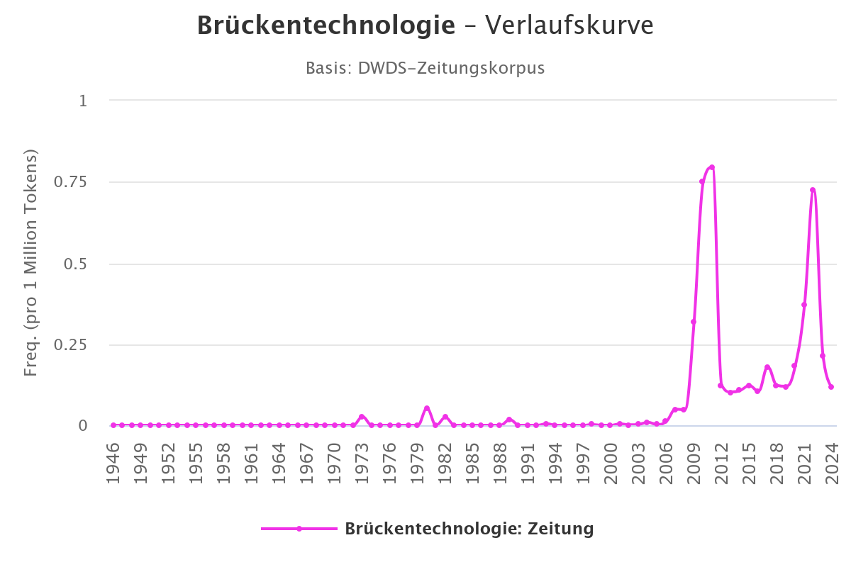 - Abb. 1: DWDS-Verlaufskurve für Brückentechnologie. Online unter: https://www.dwds.de/r/plot/?view=3&corpus=zeitungenxl&norm=date%2Bclass&smooth=spline&genres=0&grand=1&slice=1&prune=0&window=0&wbase=0&logavg=0&logscale=0&xrange=1946%3A2024&q1=br%C3%BCckentechnologie ; Zugriff: 03.01.2026.