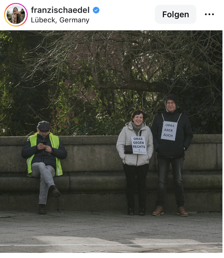 - Abb. 1: franzischaedel (2024): Aufnahme von Demonstrierenden bei Demo Omas gegen Rechts. In: Instagram, 28.01.2024. Online unter: https://www.instagram.com/p/C2nEa6osfDq/ ; Zugriff: 20.12.2025.