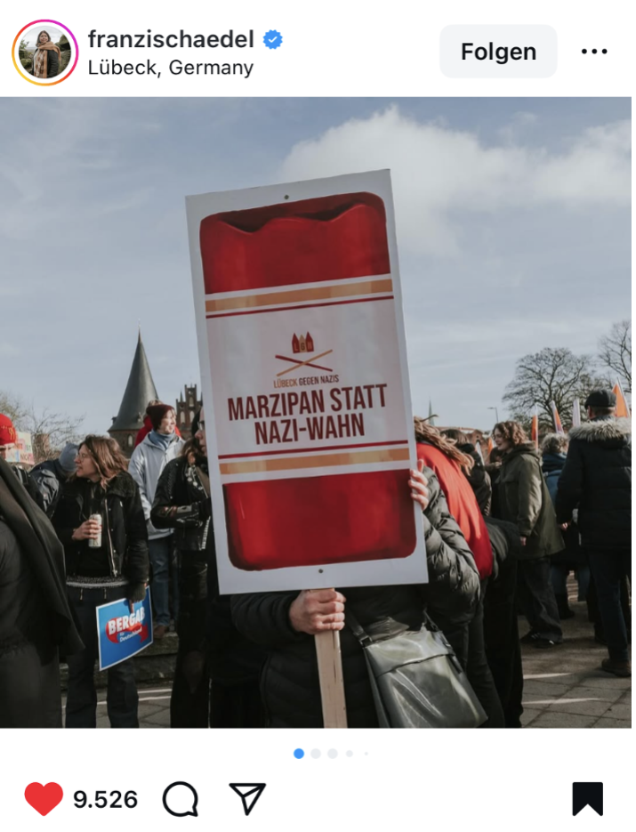 - Abb. 2: franzischaedel (2024): Protestplakat mit Aufschrift Marzipan statt Naziwahn. In: Instagram, 28.01.2024. Online unter: https://www.instagram.com/p/C2nEa6osfDq/ ; Zugriff: 20.12.2025.