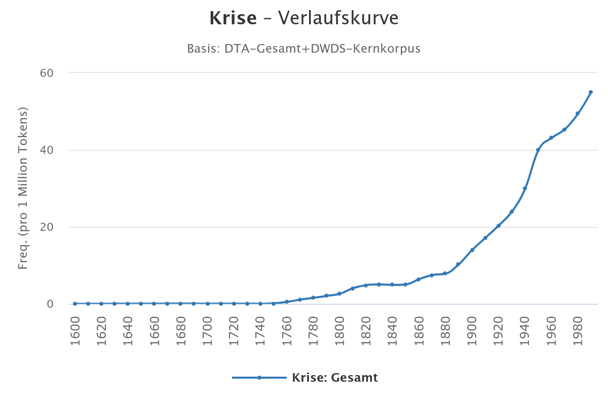 Dementsprechend zeigt die DWDS-Verlaufskurve einen kontinuierlichen Anstieg in der Verwendungshäufigkeit des Wortes Krise seit der zweiten Hälfte des 18. Jahrhunderts: