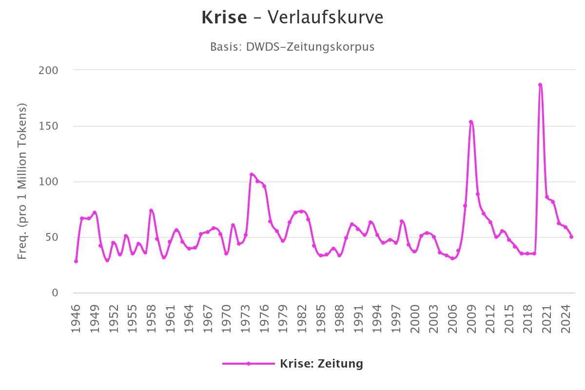 Ab 1946 bis heute lassen sich im DWDS-Zeitungskorpus Spitzen des Wortgebrauchs in öffentlich und zeitgeschichtlich als Wirtschaftskrise wahrgenommenen Phasen beobachten, so z. B. während der ‚Ölkrise‘ 1973/74 oder während der ‚Banken- und Finanzkrise‘ 2008/2009. Ein weiterer sprunghafter Anstieg in der Gebrauchsfrequenz von Krise ist während der „Corona-Pandemie“ im Jahr 2020 zu beobachten: