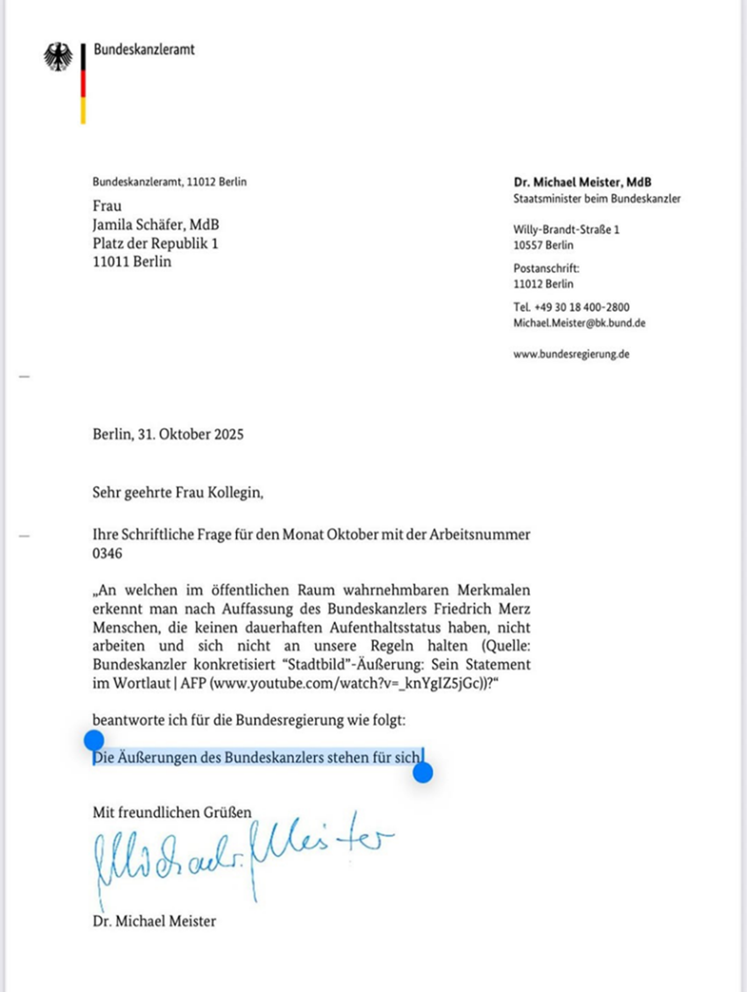 In der zweiten Oktoberhälfte 2025 sorgte Bundeskanzler Friedrich Merz (CDU) mit einer Äußerung zur Migrations- und Sicherheitspolitik für breite Diskussionen: Bei einem Regierungstermin am 14. Oktober sagte er mit Blick auf deutsche Innenstädte: