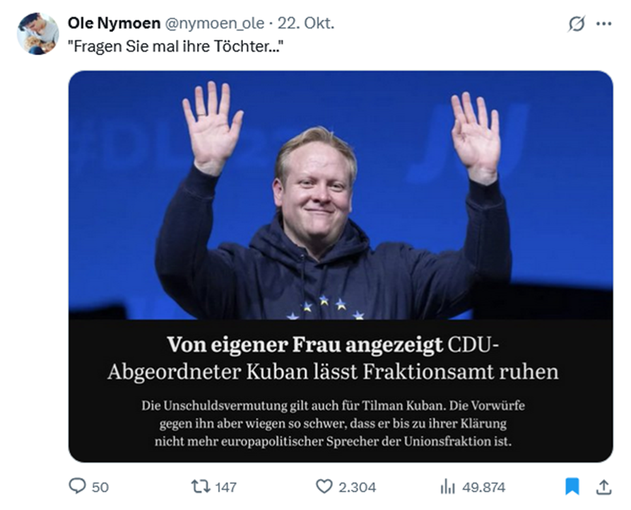 Abbildung 4: Sarkastisches Posting mit großer Reichweite als Reaktion auf Merz‘ Töchter-Äußerung: Verknüpfung von CDU, Wertediskurs und Diskurs über Gewalt gegen Frauen.
